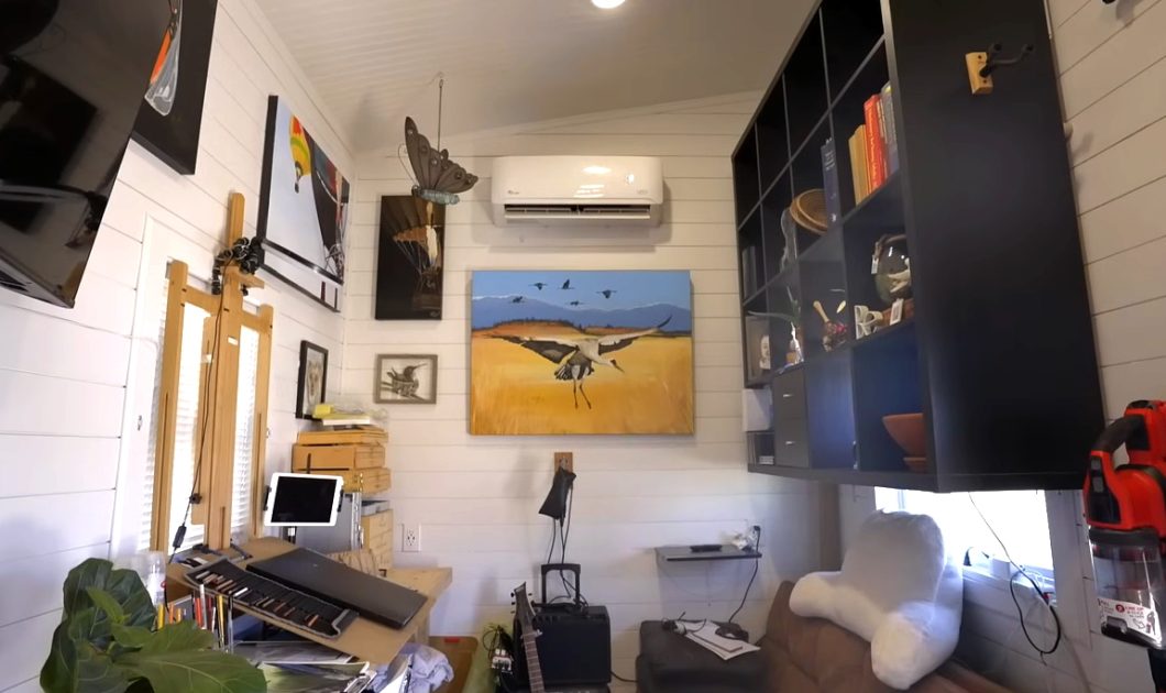 Barbara’s 24-foot tiny house on wheels doubles as her art studio for painting, drawing, and writing music. There are opportunities for creative expression in multiple areas. Her keyboard, for instance, is stored in the sleeping loft. So she can readily try out a new song idea when she wakes up in the middle of the night—not uncommon!