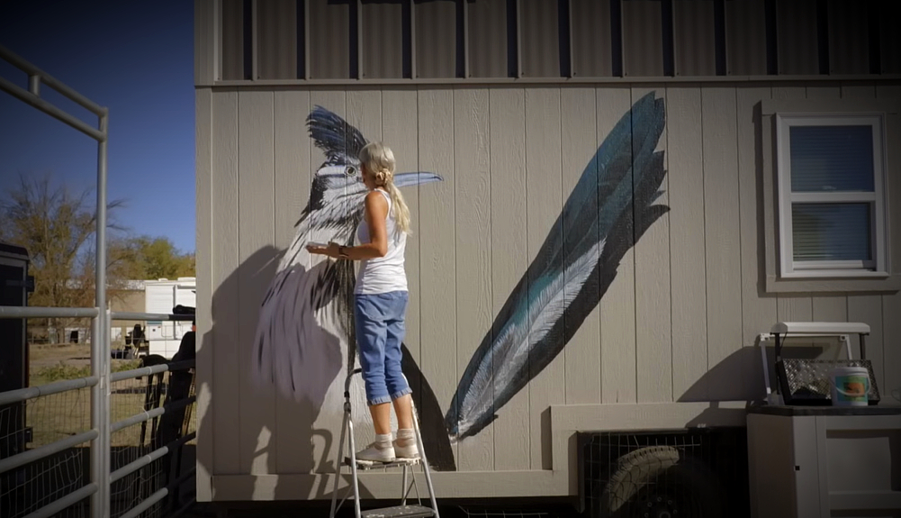 She bartered with her builder to reduce the cost of her home. Barbara received a $20k discount on her tiny home in exchange for painting murals at his tiny house/RV park in Wichita, Kansas. Once it was delivered, she began her own mural project—a sizeable striking roadrunner. It’s the first of several planned paintings to spice up the grey-painted exterior.