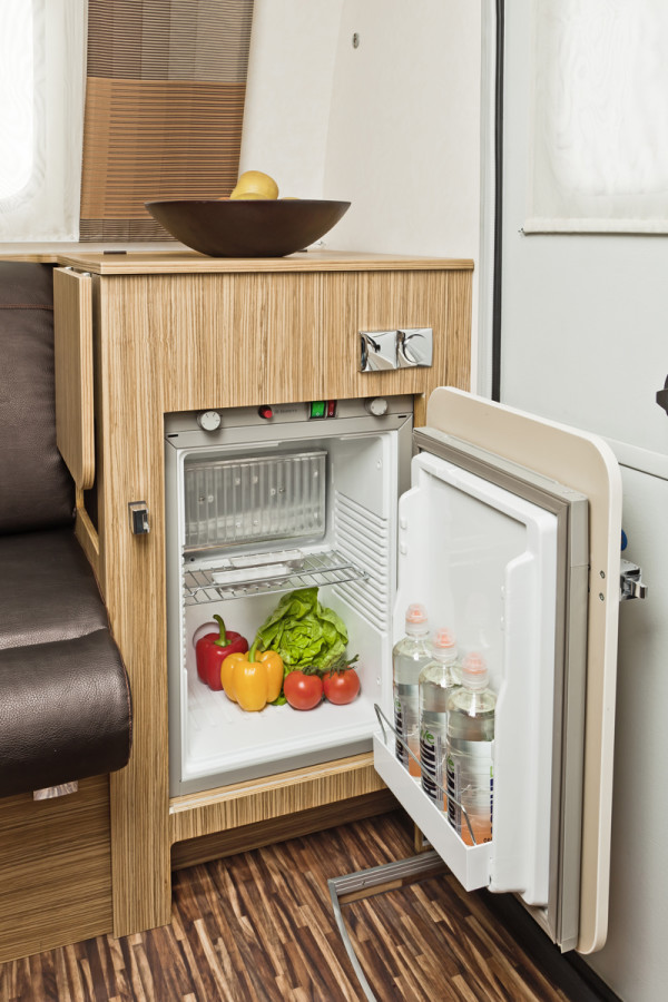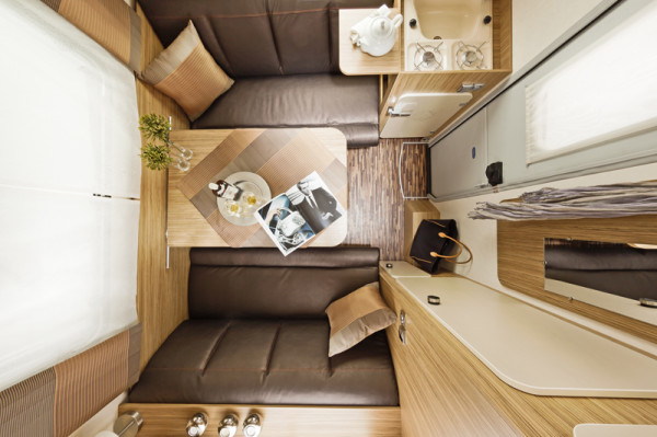 The diminutive trailer is just over 12 feet long and about 7 feet high. It weighs about 1,245 lbs. and has a maximum load capacity of about 400 lbs. It includes an awning, three windows and a skylight, outdoor lighting, integrated blinds, lights, a two-burner stove and sink, a fold-out work surface, a refrigerator, a four gallon water tank and a gas heater. It sleeps two people on the 4.5 ft. by 7 ft. fold-out bed. The trailer also contains a full wardrobe, storage under and behind the benches and above the dining area.