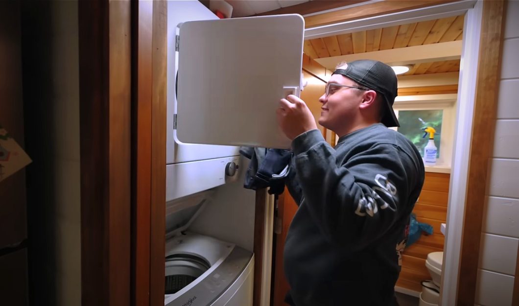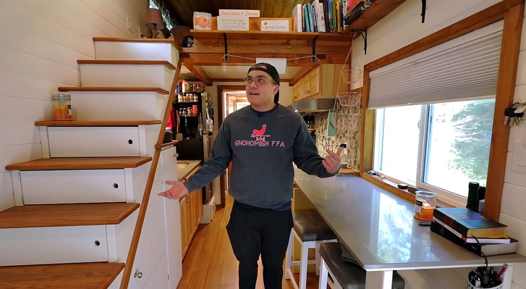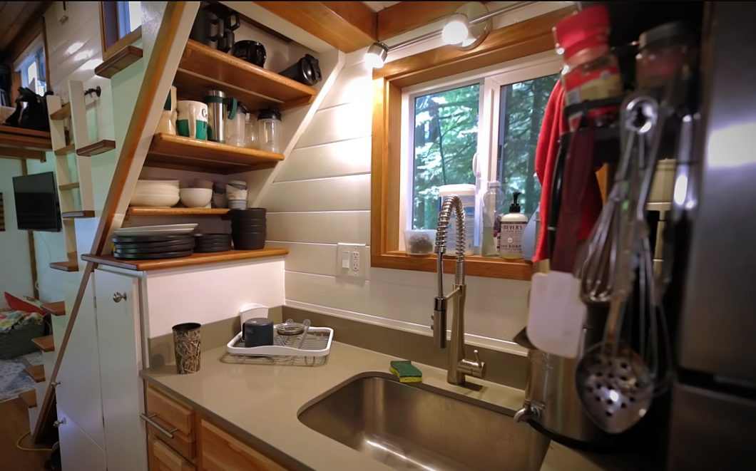 As an avid cook, Derek appreciates his kitchen’s immense storage and prep space. The shelves next to the sink provide an excellent example of the thoughtful design. They are built into the back of his upper stairs. Typically, you only find storage on the front and sides of tiny house stairs, which he also enjoys. Derek can wash, dry, and store his dishes in an efficient row.