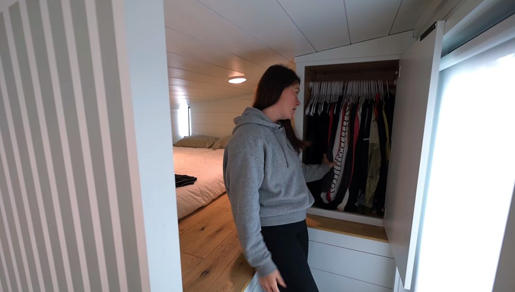Stacie chose an extra wide and long tiny house on wheels for its flexible layout. It gave her enough room to add a sofa, a 4-seater dining table, and plentiful storage. This includes built-ins, like storage stairs to each of the lofts, and a tall wardrobe that she found at Target.