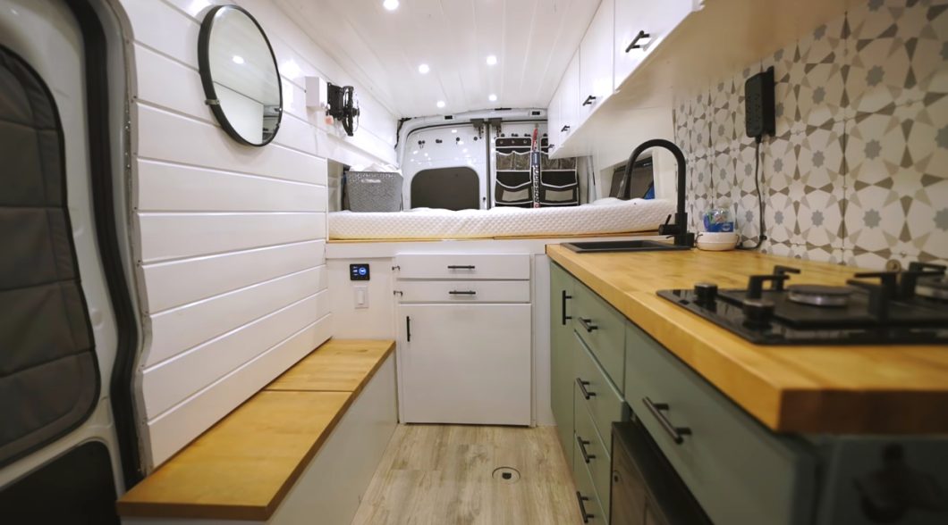 Wind River masterfully optimized the kitchen. Open shelves and windows provide a light and airy feel. While long counters and a huge sink offer a luxurious amount of workspace. Stacie has more appliances than most tiny homes. But it doesn’t feel cluttered. A couple of them are stowed in the large pantry, built into one of the staircases.