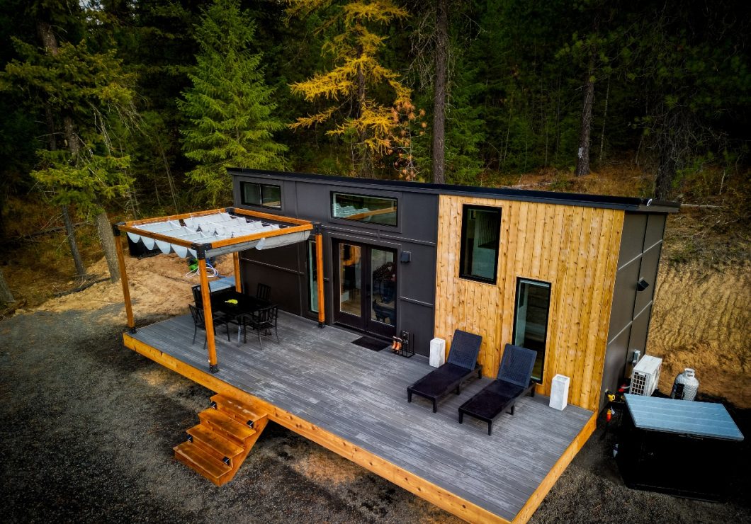 Outdoor enthusiast and entrepreneur Stacie lives in a stunning tiny house on land in northeastern Washington. Built by Wind River, it’s a spacious 10 feet wide by 30 feet long (3-m by 9-m). She designed it with their team to be open and airy with lots of natural light. So, a wall of windows was a must-have. French doors add to this. When open, Stacie doubles her living space with a 10-foot by 30-foot deck.