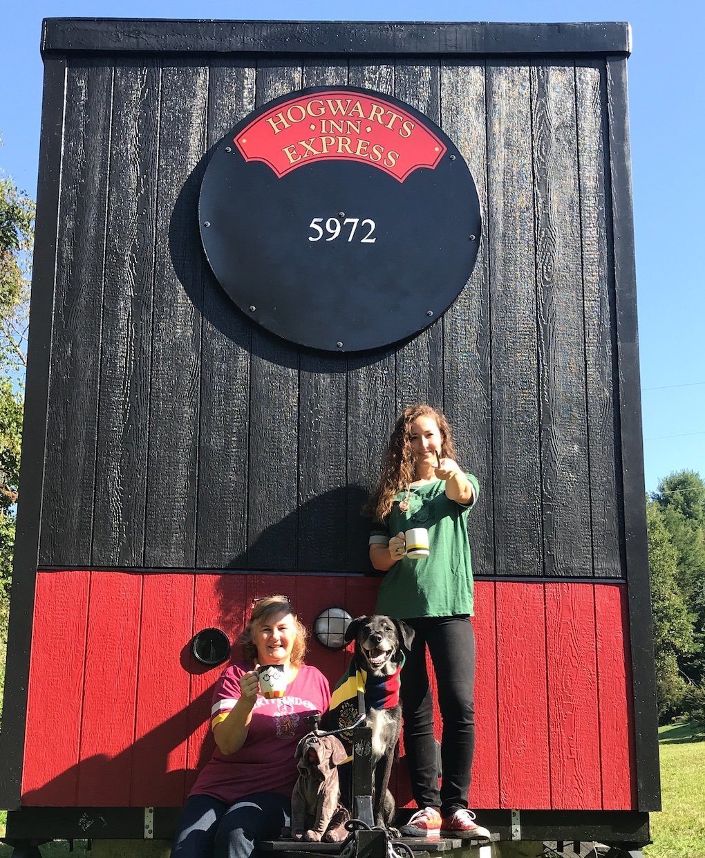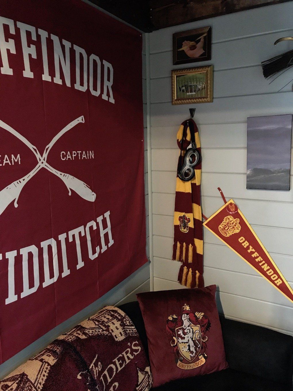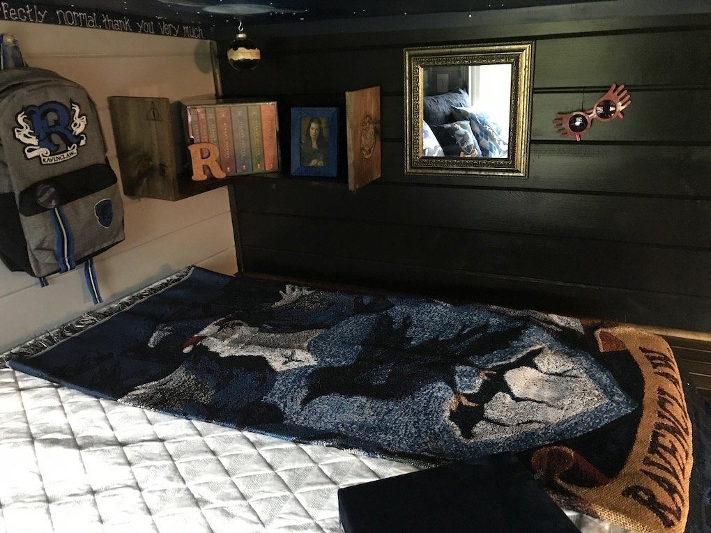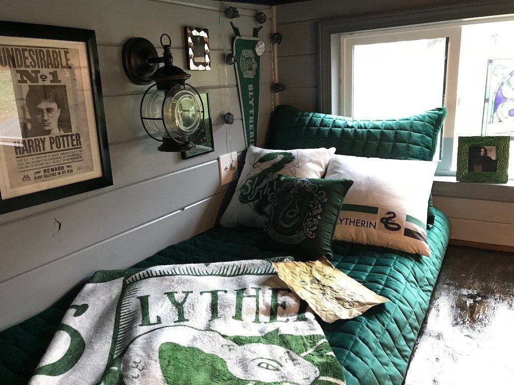 We have just completed the project. It is called The Hogwarts Inn Express, a Muggle Motel, and is on a 24′ trailer. The house is totally Harry Potter and comes fully furnished and decorated. There are over 100 licensed products, as well as many many handmade items. The design is based on including each of the four ‘Houses’ of Hogwarts, and the main elements of the books throughout. We have included a relatively large bathroom with a standard shower and vanity. Because we didn’t know if the new owner would want a composting toilet, or to plumb for a standard toilet, we have left that one item out, for now. The kitchen includes a sink, fridge, mini-microwave, and portable cookout. We would consider including a convection/microwave, although based on the size, we felt it would diminish the Hufflepuff kitchen look. There is a Gryffindor living room with a convertible sofa and small chair, Roku smart tv, echo dot, trunk-style coffee table and fireplace mantle (no real fireplace) with shelving. For sleeping, there is a Ravenclaw loft, which serves as the master and has a double-size 5″ memory foam mattress, and is accessible by a small bunk-style ladder. A smaller loft is located over the bathroom and features a small twin mattress. It is accessible by steps, which help create the ‘Cupboard Under the Stairs,’ a tiny cubby that could be an excellent tiny house closet; although we love it as a mini private reading nook.