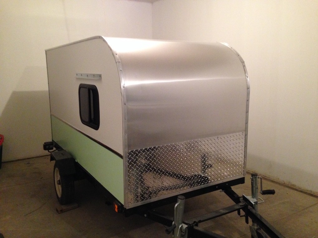 Birch plywood was used for sides and back with simple framing like they do with teardrop trailers. We insulated the floor, secured it to the trailer and also insulated the ceiling. We used good rv style windows with screens and a insulated door on the back. Simple electric with a light and a plug in is all we needed with some other battery powered lights. I made it so there was a plug to use at campgrounds if needed. My wife made custom curtains and helped me paint it. Being busy we just couldn’t enjoy it enough and decided to let it go last fall and didn’t take a long. A lucky couple bought the trailer to enjoy camping on the weekends. With the trailer it can be built by yourself for around $1500 to $2000 depending on where you source your materials. Everything besides the windows, doors, trim, and aluminum for the roof was found at a local big box store. The door, windows, trim was ordered online and the aluminum skin for the roof was sourced locally from a metal supplier. If you found some used stuff for your own design that would save some money.