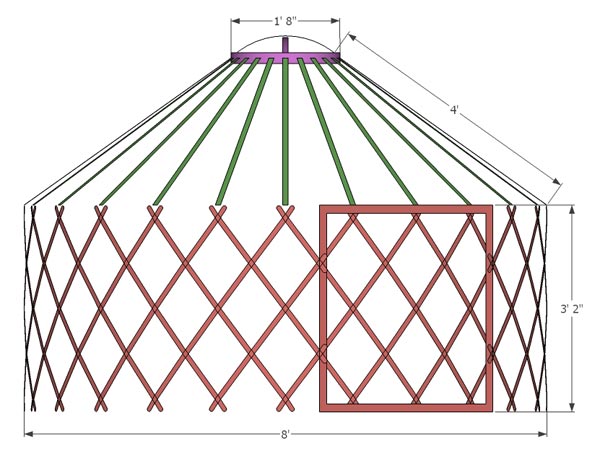 I think I settled on the ger primarily for the added build challenges and exotic appeal, but round structures have a few advantages too. The ger is free-standing and does not need any guy lines, but most significant is wind resistance. During the first week of the apprenticeship, other apprentices in the mobile home and camper trailer couldn’t sleep inside their rocking, sail-esque boxes, while the winds simply swirled around the conical ger.
